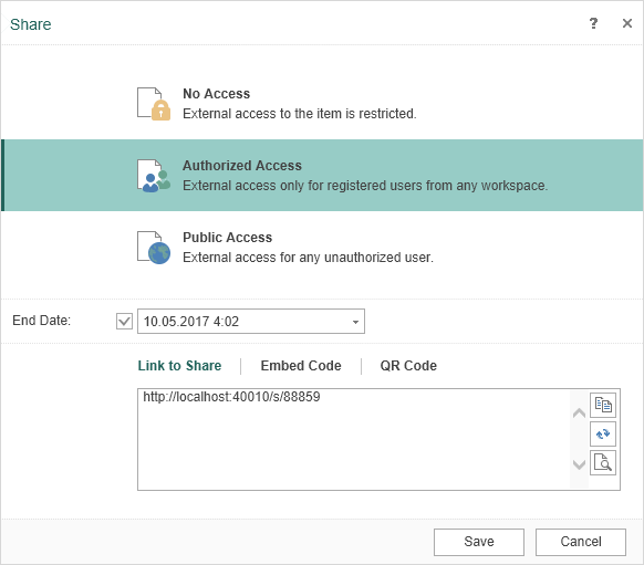 Some elements of the navigator list, can have access from the outside, declared in one of the three levels ShareLevel (Private and Public). You can also set an expiration date of public access. Manually these parameters can be set on the following form: