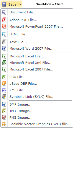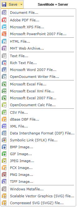 When you export a report to any format, saving the report will take place in one of the following saving modes: Client or Server. Using the SaveMode property it is possible to change the mode of saving. If the SaveMode property id set to Client, then the report will be saved on the client-side of the WebViewerSL application by means of Silverlight without a server. If the SaveMode property is set to Server, then saving the report will take place directly on the server, and after saving the report will be transferred to the client-side. Depending on the value of the SaveMode property user will see different the lists of export formats. The picture below shows lists of exports in various saving modes: