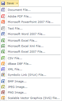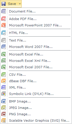 A report opened in WebViewerSL can be exported to many different formats. The list of formats for export can be customized. In other words, you can hide unused export formats. Customization of the list of formats of exports can be made by means of WebViewerSL properties. For example the HTML format, in the Client saving mode. Showing of this format in the list of formats for export depends on the value of the ShowHtmlButton property. The picture below shows the complete list of formats in the Client save mode: