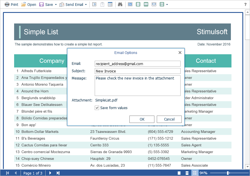 After confirmation of sending the email the above described EmailReport event will be called. You can check and correct the data entered in this form. The exported report file will be attached to the email automatically.