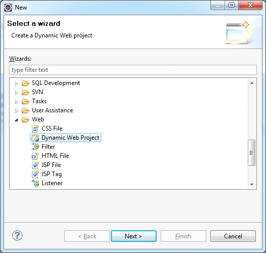 Launch the Eclipse IDE, choose File> New> Project. In the project wizards open the Web type and in the drop-down list select Dynamic Web Project wizard and click Next (Figure 1). Select dynamic Web project: