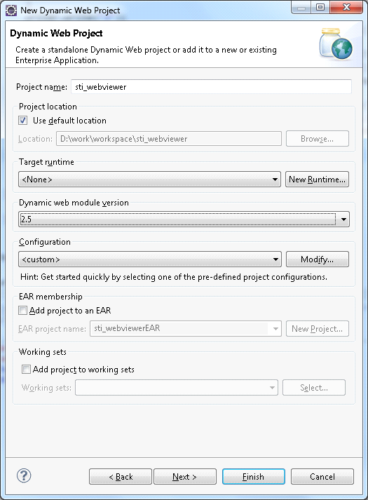 In the window opened fill in the Project name (e.g. sti_webviewer, as shown on Figure2). Then configure the web server, on which the application will run. Create a new dynamic Web project: