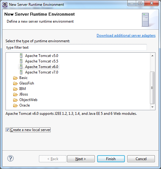 Under Target Runtime, you see <None>, as shown in Figure 1, because you haven’t created a runtime yet for Apache Tomcat. Click New Runtime to open the New Target Runtime Wizard. Select Apache Tomcat of the correct version from a list. Check Create a new local server as shown on Figure 3, then click Next.Create a new server runtime: