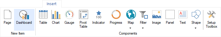 Select items on the Toolbox or the Insert tab and left-click in the dashboard panel.