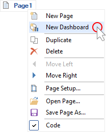 - Select New Dashboard in the context menu of the page title or dashboard panel.