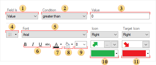 The Icon parameter. It is used to enable and locate the icon relative to the value in the cell in the pivot table to which the conditional formatting will be applied. The Icon Type parameter. It is used to select a value icon from the list of Stimulsoft icons. You can also load a custom value icon. To do this, click the Browse button and select the icon from the repository.