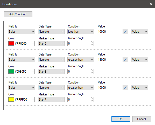 For each new condition, you should specify the parameters of its applying. The color will be applied to the specific value of the element if the condition is executed.