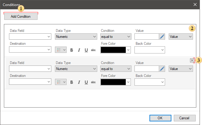 For each new condition, you should specify the parameters of its application and design settings. Design settings will be applied to the cells of the pivot table, if the condition will be executed.
