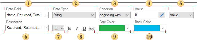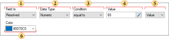 For each new condition, you should specify the parameters of its applying. The color will be applied to the specific value of the selected data columns if the condition is executed.