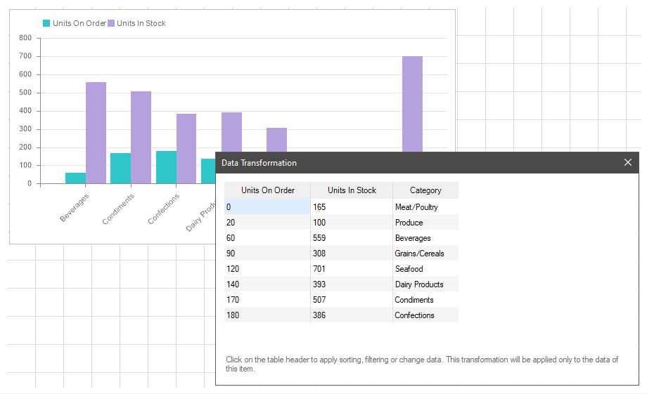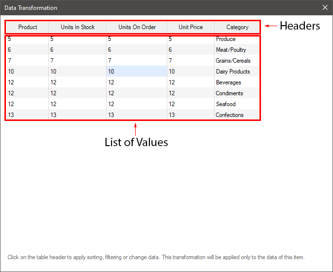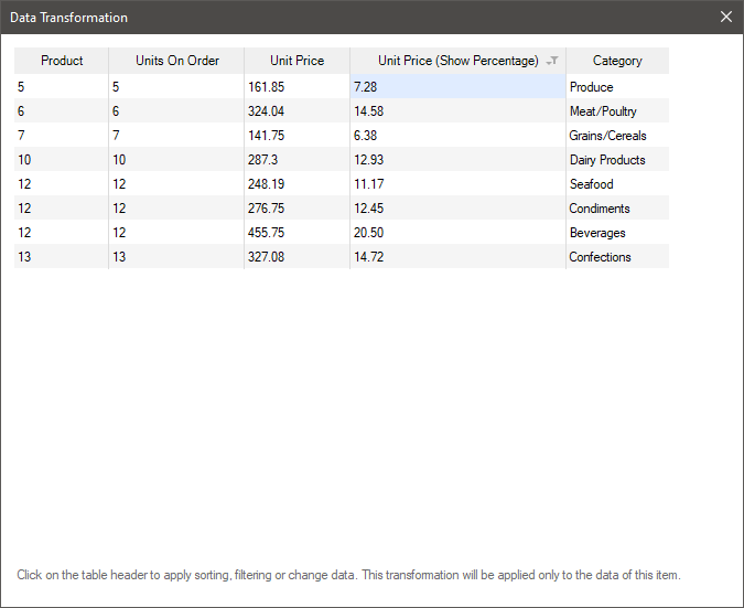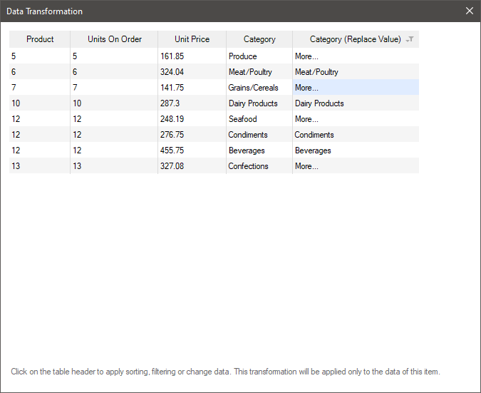Data transformation is configured only for a specific element of the dashboard. All data transformation settings are applied only to the current element and are not applied to the data of the other elements of the dashboard.
