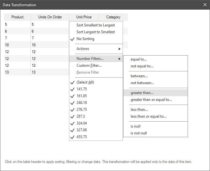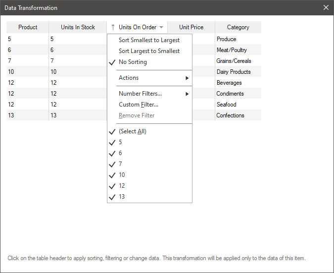 All data transformation settings are located in the command menu. To call this menu, left-click on the header of the data column.