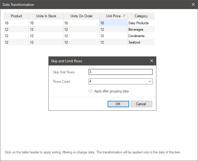 In the dialog that opens, specify the number of lines to skip. The default value is 0, no rows in the table are skipped.