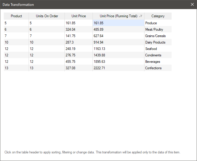 When designing a report, it is often necessary to calculate the cumulative total. The cumulative total is the calculation of a new value, as a result of adding the current string value to the sum of the previous values. You can enable the function to calculate the cumulative total for the item data field in the Data Transformation of the element.