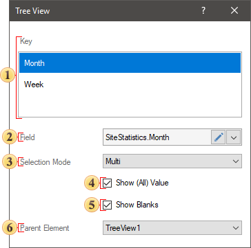 The Key field. The data item is specified, the values of which will form the hierarchy and be displayed in the Tree View item.