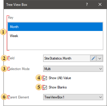 The Key field. The data item is specified, the values of which will form the hierarchy and be displayed in the Tree View Box item.