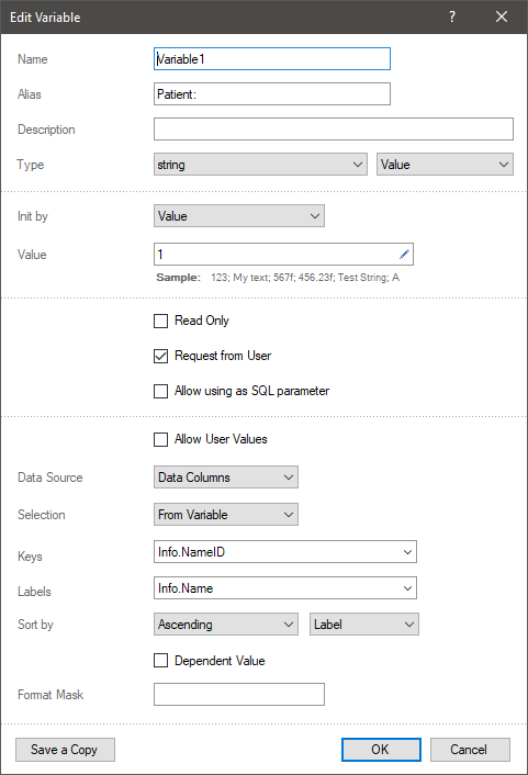 At the same time, since there are more than one patients, it is necessary, when choosing a patient, to display the results of the his/her examination. In this case, it is necessary to create a variable with a list of patients, as well as provide the user to select the value of the variable. To do this: