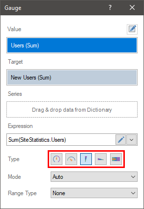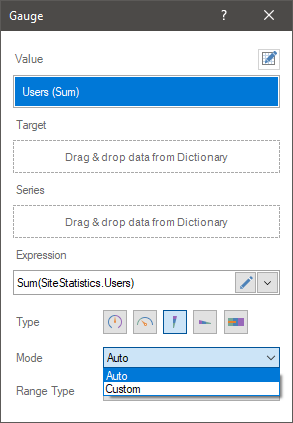 Select the Auto value in the Mode field to enable the automatic mode for calculating the range of values of the gauge scale.