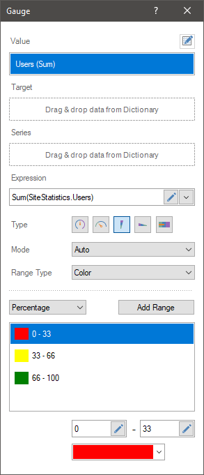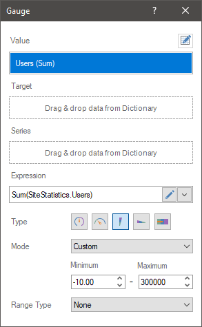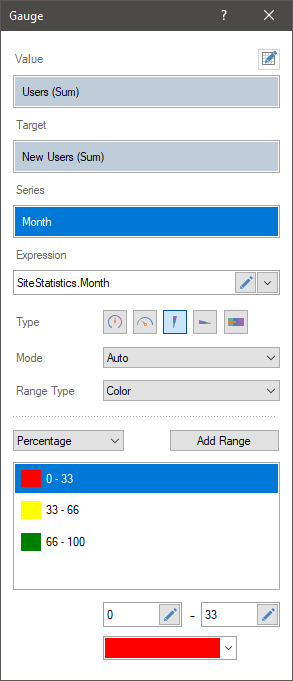 Regardless of the gauge type, its values and series, you can define a range of values. By default, the AutoRange mode is used. In this case, the initial and final value of the gauge scale is calculated automatically. However, if you need to specify a specific range of values, you should do the following: