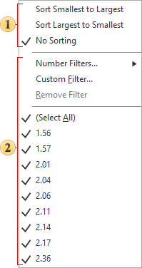 Commands to filter table data and related items by the values of the current column. In this case, the data filtering is carried out on the same principle as when converting data - a typical filter, a custom filter, the selection of values.