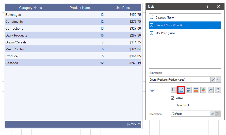The Summary Type parameter allows you to select the function which will be applied to calculate total for the current data field.