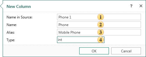 To create a new column select the data source, which will be added to the data column, and select New Column… in the New Item menu or the context menu of the selected data source. After selecting this option the New Column dialog will be invoked. In this dialog you should specify new columns. The picture below shows a New Column dialog: