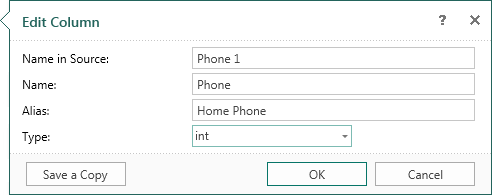 The data column can be edited. To do this, you must select Edit in the context menu of the selected column, or click the Edit button on the toolbar in the data dictionary. After that, the user will be shown the Edit Column dialog, where you can change settings such as Name in Source, Name, Alias and Type of the edited column. Press OK to apply changes. The picture below shows the Edit Column dialog: