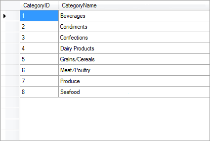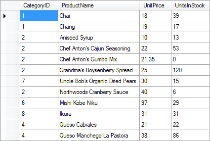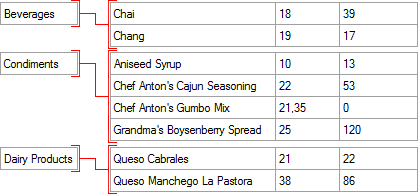 The relation is organized by the key data columns. Key data columns are present in the data sources, among which a relation is organized, and contain the keys. For example, in Categories and Products data sources the key columns are CategoryID. It should be noted that in this example, the names of key columns are the same, but this is not a prerequisite. The key data column in the data source Categories is called CategoryID, and the data source Products - CategoryNumber. Organizing the relation between data sources Categories and Products by the key columns CategoryID, where the data source Categories is the master data source, and Products is a detail data source. The relation between data sources will have the form as shown in the picture below (partially):
