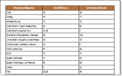 Stimulsoft Reports tools can display data from a bound data source. For example, data from columns are displayed in a report: ProductName, UnitPrice, UnitslnStock of the data source Products. The picture below shows the a page of the report: