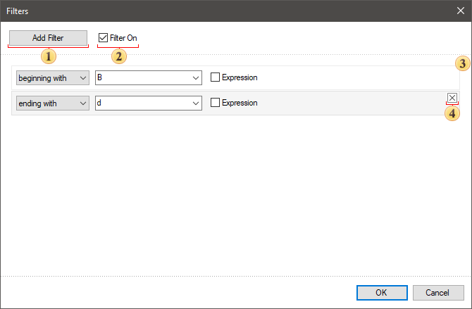 • You should click on the data field header in the preview. Select the Custom filter command in the drop down menu. After that, the filter editor will be called where you should add filters, define a logical operation and a value. When this filter triggers, i.e a definite logical condition is carried out, the values will be filtered in the current field. You should understand, that data are filtered with rows, i.e if a logical operation triggers for a definite value of one field, the values from other fields of this row will be displayed. Besides, you can specify the Expression as filter value. In this case, the result of expression calculation will be a value for a logical condition in a filter.