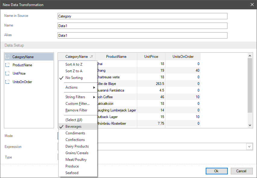 Step 1: In the preview, you should click on a field header and check a box next to the values, which need to be displayed. In this case, the filtering is carried out by the set of categories, only data for the Beverages category will be displayed.