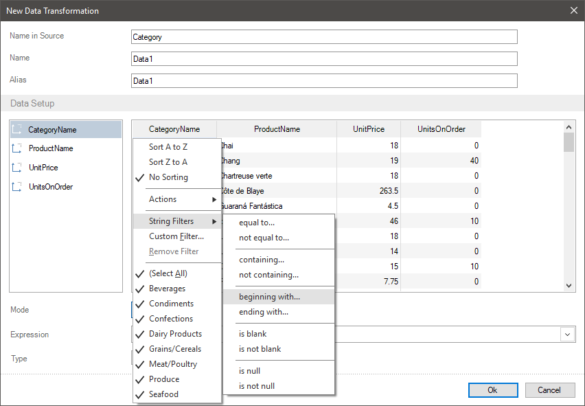 Depending on data type of the current field, the filters of data type and their logical operations can be different. For example, there are different operations for string values, numeric values, and dates. Step 1: You should click on a field header in the preview, in the menu of the filter of data type (for example the String Filters), select a logical operation. In this case, you should select the beginning with operation for category name.