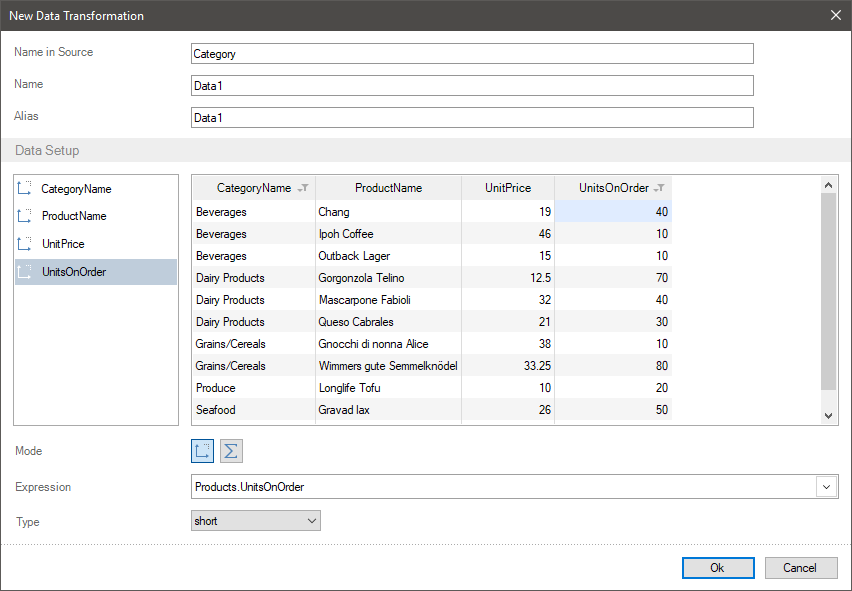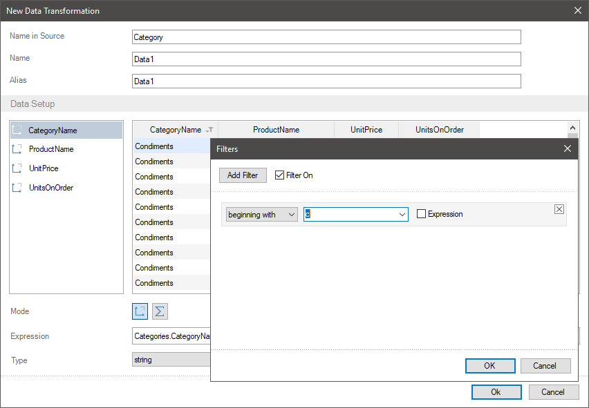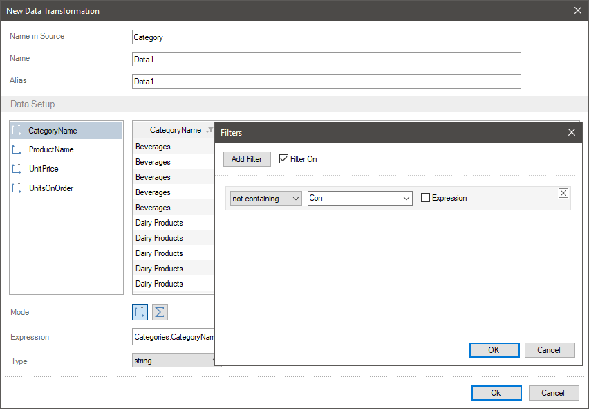 Let`s consider the examples of data filtering when creating a new data transformation. Imagine, a new table contains fields with the names of product categories, the products with price for each product and the number of orders for each product.