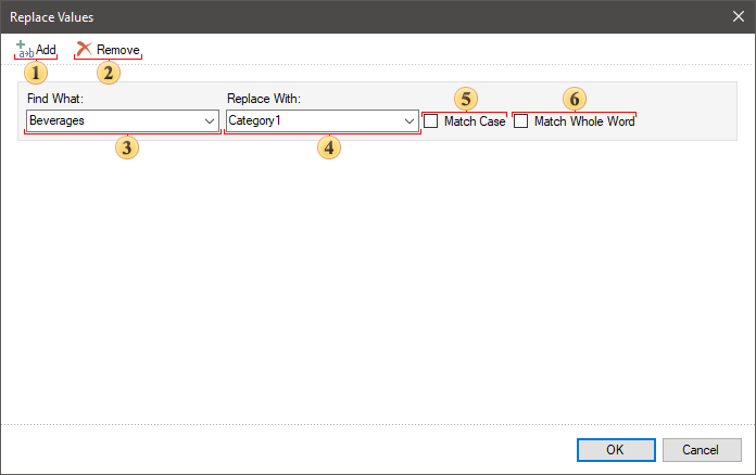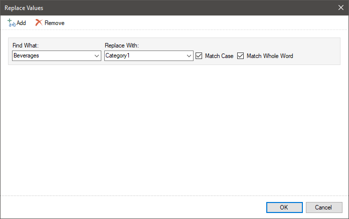 The Match Case parameter enables the mode in which a value will be replaced only if a register of an original value (a value specified in the 3 field) fully corresponds to the value in a data field. If this parameter is disabled, when analyzing values in a data field, the register is not taken into account.