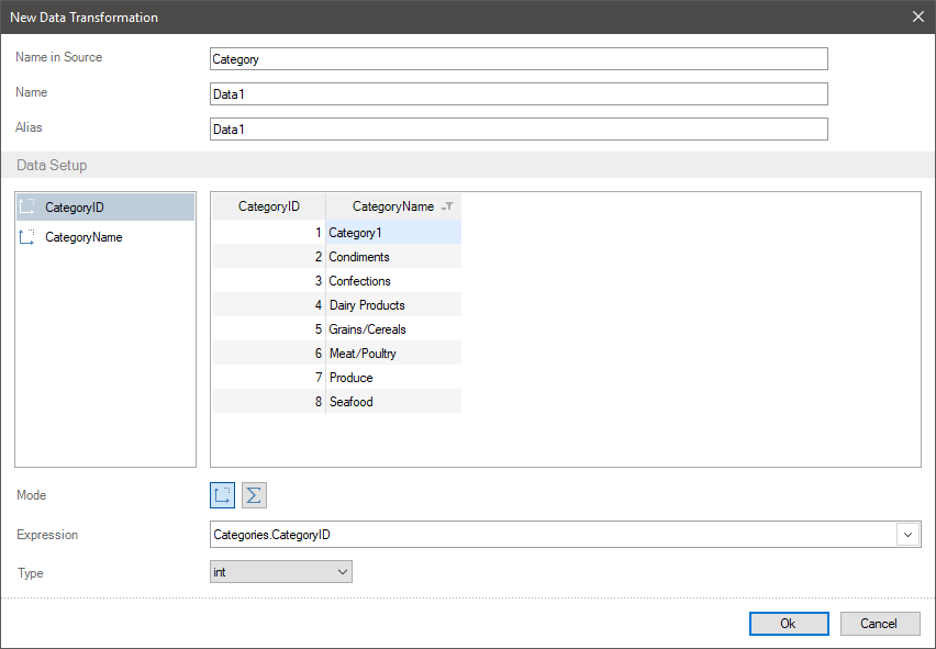 Step 1: Add data fields to a list of data transformation fields. For example, the numbers of categories and their names.