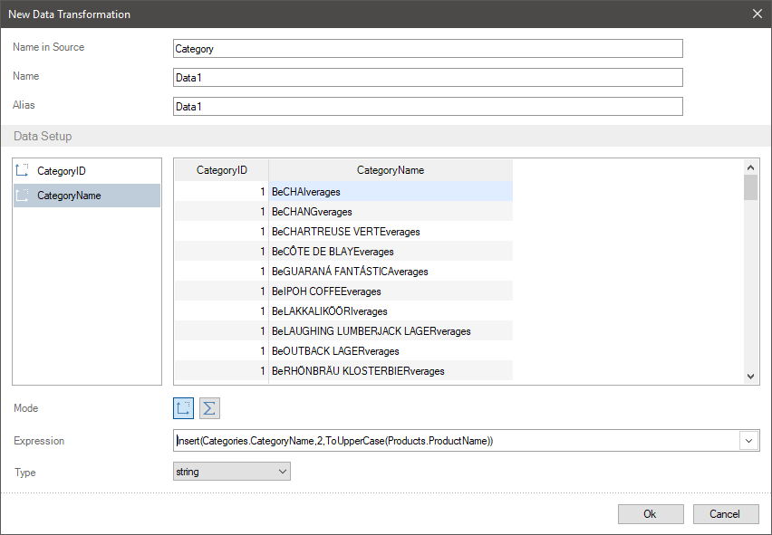 Let`s insert the names of products into the names of categories, after the second character. In addition to this, drag the names of products for visual selection into the upper case. To do that, you should change the Categories.CategoryName element expression to the Insert(Categories.CategoryName,2,ToUpperCase(Products.ProductName)).