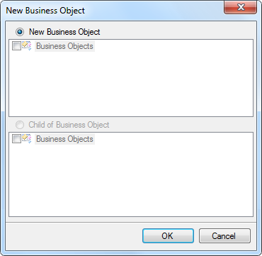 It should be noted that a child business object can be created for each business object. To do this, select the business object and call the command New Business Object… Then, the first dialogue box of New Business Object will be called, in which the option Child of Business Object will be checked. After you click OK in that dialog box, the second dialog box will be opened. There you should specify the parameters of the new business object. The picture below shows the second dialog box of New Business Object: