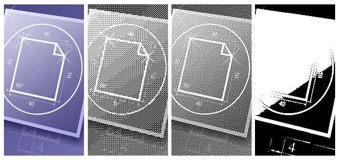 Dither is an intentionally applied form of noise, when processing digit signals. It is used in most often surfaces in the fields of digital audio and video. The following image shows (from left to right) original image and the result of export to monochrome image. There are three modes of DitheringType: Ordered, FloydSteinberg, None.