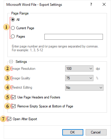 The checkbox Use Page Headers and Footers is used to define the Page Header and Footer as the header and footer of the Word document. If this option is not set, then, after exporting, page header and footer will be a table cell or an individual frame. In case of editing a report they may change its location. If this option is enabled, the data bands will be output as objects a header and footer in the Word document.