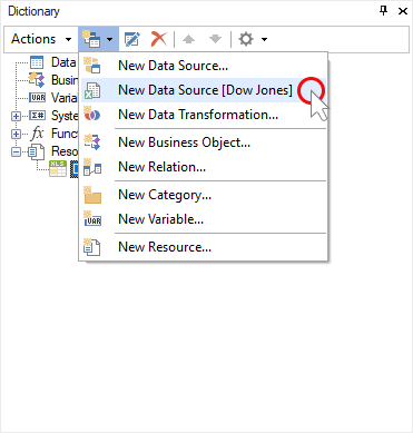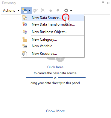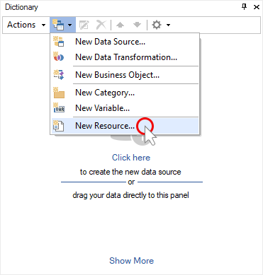 Step 3: Click the New item button in the data dictionary and select the New Data Source [resource name] command;