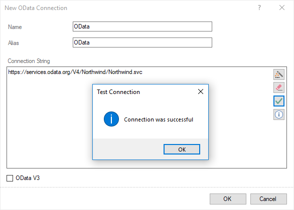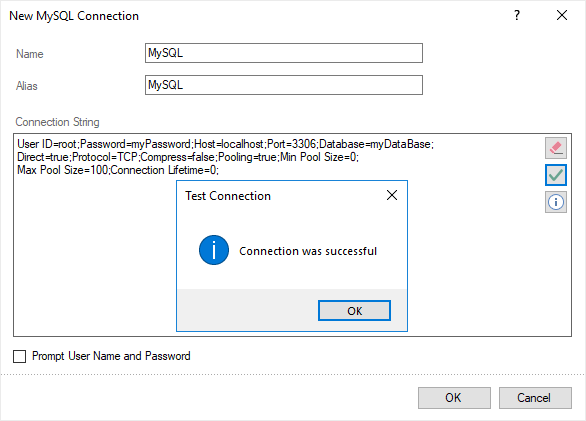 Step 8: Click the Test button to test the connection. At the end of the test connection process, a message will be displayed. If the connection is successful, click OK in the New Connection window.