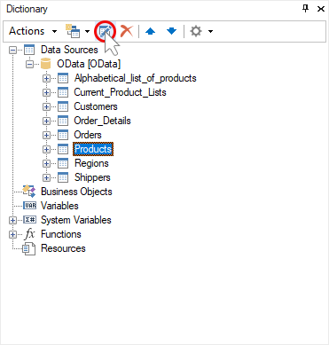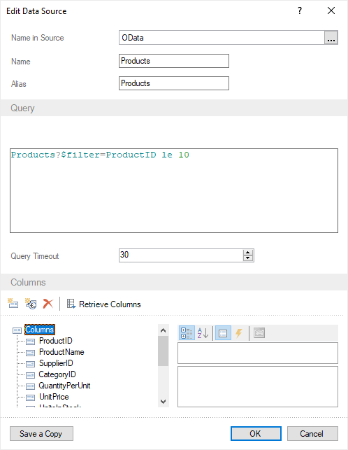 Step 3: Specify the data filtering request in the Edit Data Source window. For example, Products?$filter=ProductID le 10 and click OK in the current window.