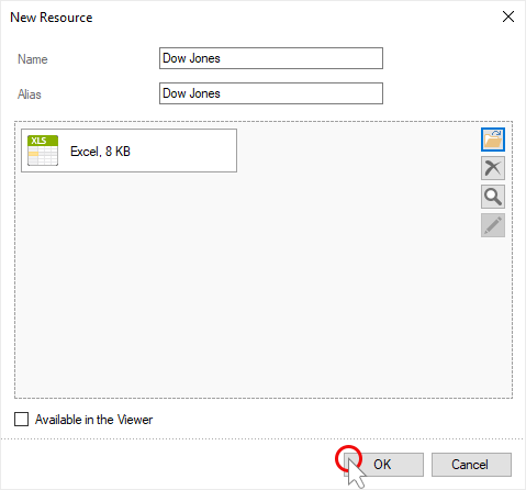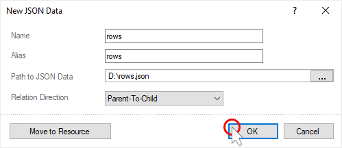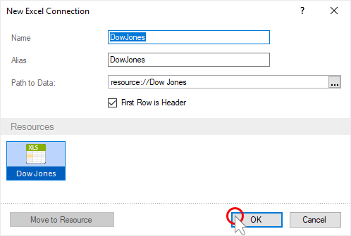 In the New Resource window that pops up, click the Open button to select a data file. Then, click OK in the New Resource window.