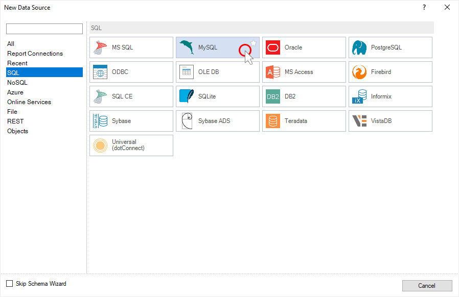 Step 4: Select the type of a data source. In the current example, we have selected MySQL;