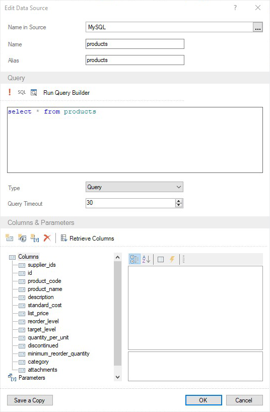Step 3: Specify a request for data selection in the Edit Data Source dialog. For example, select * from products;