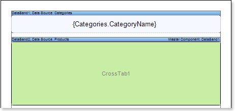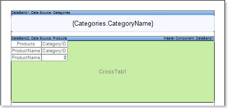 If the Cross-Tab component is placed in the DataBand, then when designing a report, this component will be constructed as part of the DataBand. Because the Cross-Tab component placed in the DataBand is designed as an element of the DataBand, then, when designing a report, this component will be printed as many times as the DataBand. Consider an example of building a report with the Cross-Tab in the DataBand. In this example, Cross-Tab will display the detailed entries in the Master-Detail report. Do the following steps to build a report with the Cross-Tab in the DataBand: