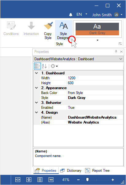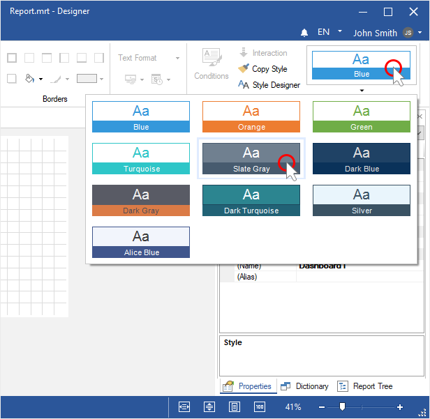 Dashboard design Step 1: Select a dashboard; Step 2: Click the select style on the Home tab in the report designer; Step 3: Select a style for your dashboard.