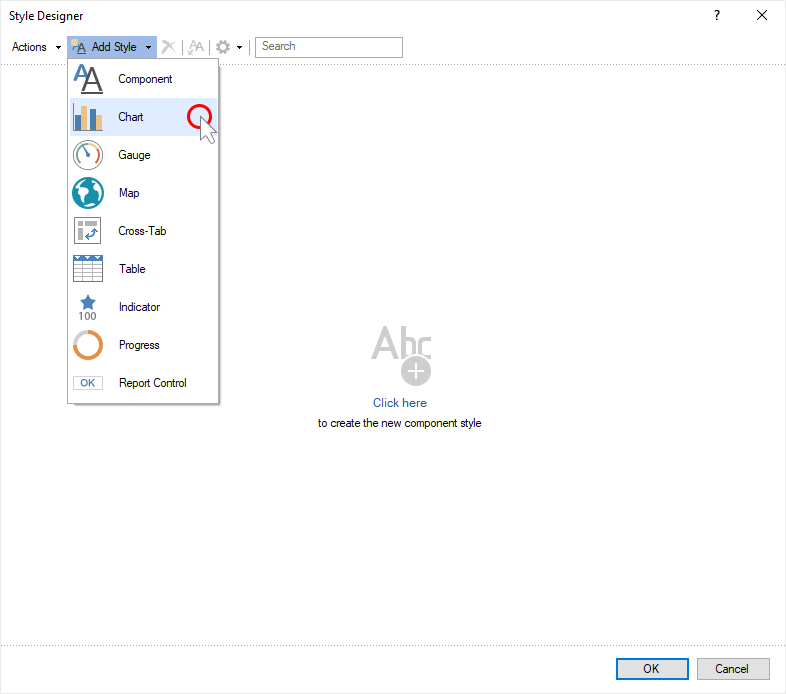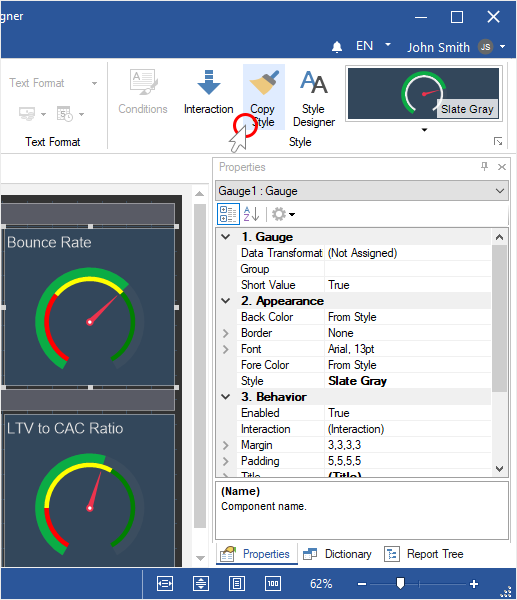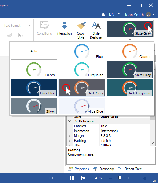 Dashboard elements design Step 1: Select a dashboard element; Step 2: Click the select style on the Home tab in the report designer; Step 3: Choose a style for the dashboard element.