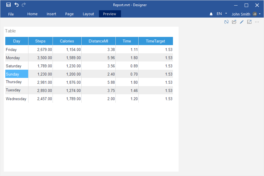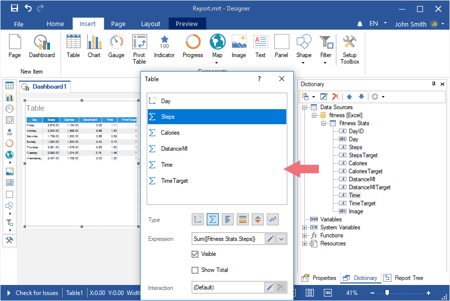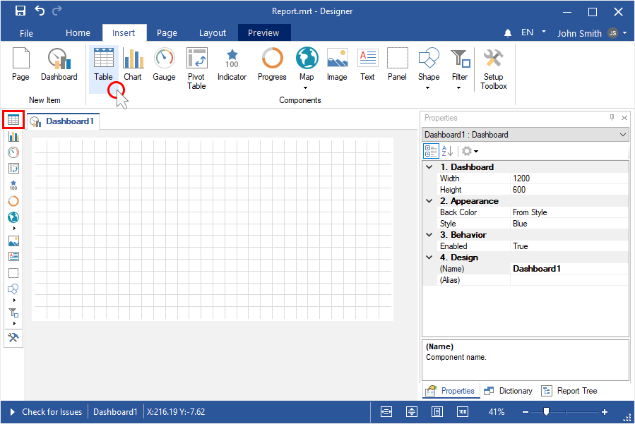 Step 4: Select the Table element on the tools of the report designer or on the Insert tab;