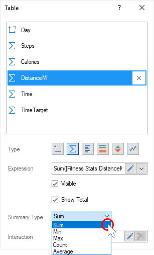 Step 9: Click the Browse button in the Expression field and select the function of aggregating values, if necessary. By default, the Sum() function is used, which sums the values from the specified data column.