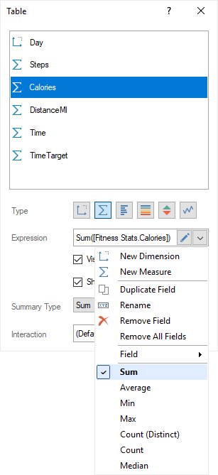 The aggregation functions are not applied for data fields of the Dimension type. To apply a function to a specific field, you should set its type as Measure.